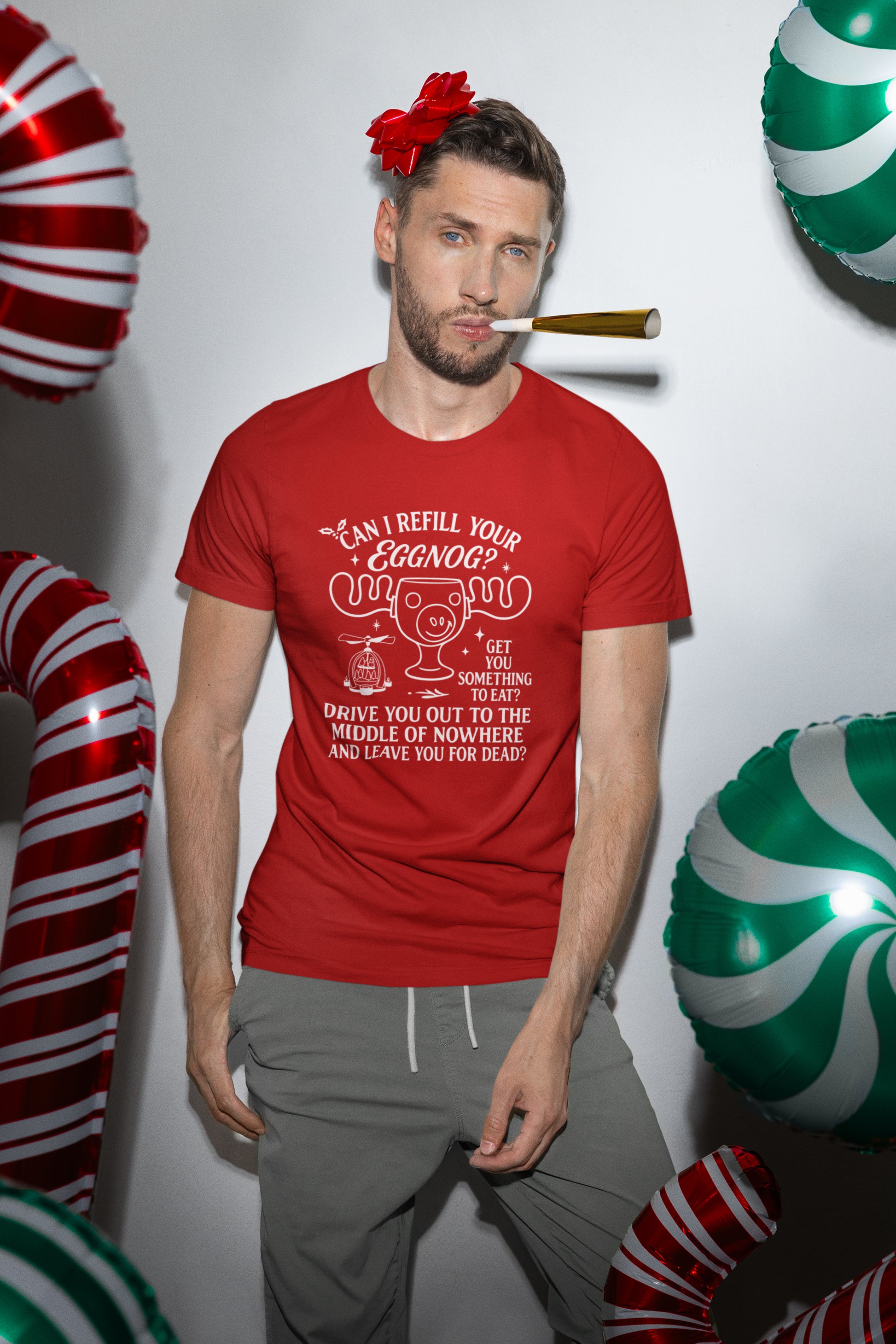 Bring the holiday cheer with our "Can I Refill Your Eggnog?" Moose Glass T-shirt inspired by the classic comedy movie Christmas Vacation. Celebrate the holidays and the hilarious moments with this shirt. Perfect for any holiday party.
